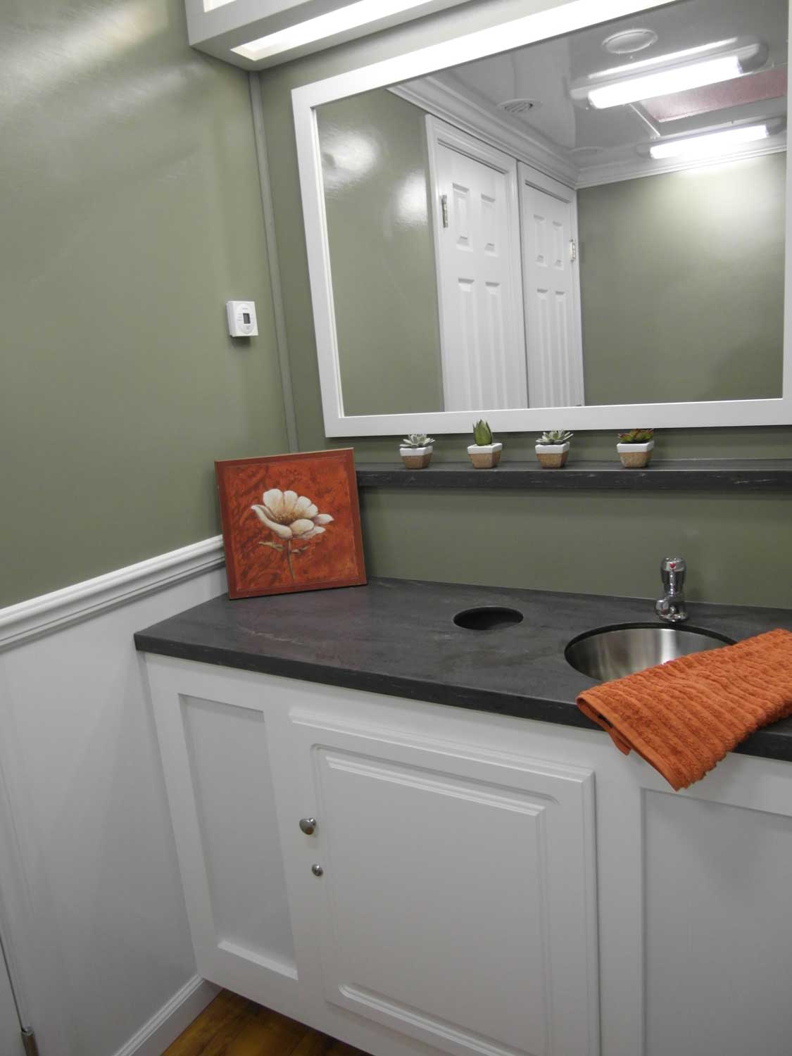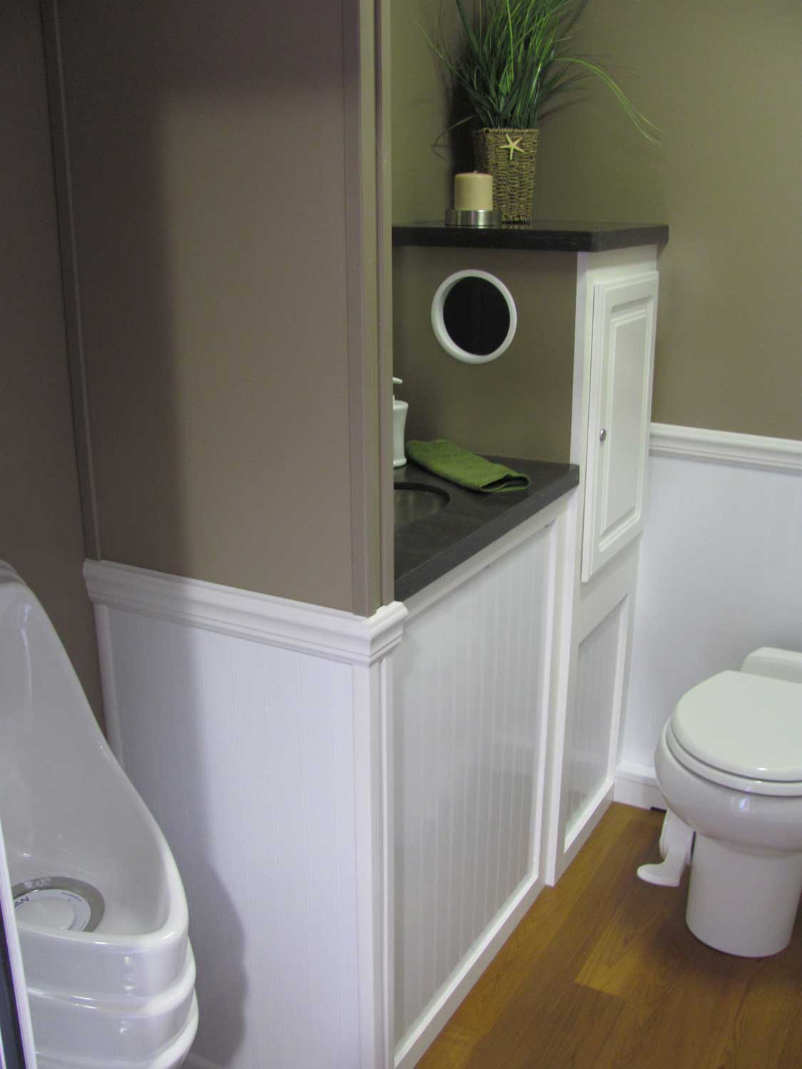 Impress Your Guests! Have an upscale event? From Weddings to Corporate Events, rent one of Perfect Potty, Inc.'s luxury restroom trailers. The Country Chic and The Cottage trailers offer a stylist neutral palate and clean look - just what you need to complete your special outdoor event. These units feature porcelain flushable toilets, wood-grain flooring, air-conditioning, heat, am/FM radio, CD player & Bluetooth connect, Corian vanities, vessel sinks with hands-free faucets. The Country Chic and the Cottage offers a high-end mobile restroom solution with a fresh style not found anywhere else.